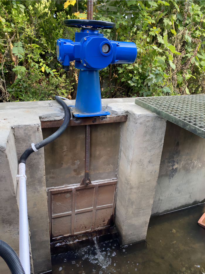 此處為手動圓盤式閘閥,改造需要把閘桿更換加裝電機(jī),改造閘門可以遠(yuǎn)程聯(lián)動控制啟閉。三個閘閥共用一個控制柜,節(jié)省成本,方便管理,安裝在泵房內(nèi),不易破壞。泵房內(nèi),兩臺25kw的水泵控制直接啟動,為實現(xiàn)自動化及保護(hù)水泵,采用軟啟動控制柜,更穩(wěn)定,不容易出故障。