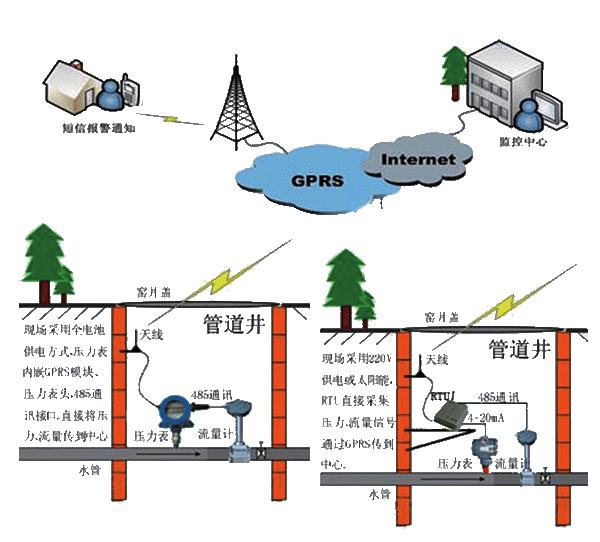 一、系統(tǒng)簡(jiǎn)介 為保證供水工作的科學(xué)性,依靠現(xiàn)代計(jì)算機(jī)通信技術(shù)和傳感技術(shù),實(shí)施對(duì)供水管道的無(wú)人化遠(yuǎn)程實(shí)時(shí)監(jiān)測(cè),并且能夠自動(dòng)傳輸?shù)缴厦娓骷?jí)主管部門,監(jiān)測(cè)輸水管道、城市供水管道的壓力、流量信息;及時(shí)發(fā)現(xiàn)管網(wǎng)故障,提高維護(hù)效率、降低損失,保障輸水、供水質(zhì)量,達(dá)到科學(xué)預(yù)警,減少成本,提高效率的目的。 二、系統(tǒng)組成 v 監(jiān)控中心:中心服務(wù)器、外網(wǎng)固定IP、管網(wǎng)系統(tǒng)軟件; v 通信網(wǎng)絡(luò):基于移動(dòng)GPRS或者電信CDMA的通信網(wǎng)絡(luò)平臺(tái); v 采集終端:無(wú)線壓力表/低功耗遙測(cè)終端BTU; v 測(cè)量?jī)x表:流量計(jì)/脈沖水表、壓力變送器、報(bào)警設(shè)備等; v 供電方式:電池供電、太陽(yáng)能供電、市電。