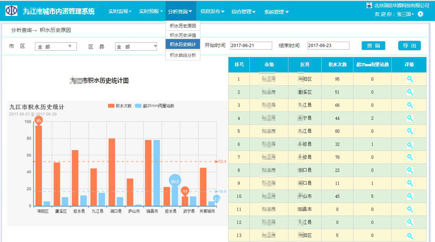 3)查詢站點數(shù)據(jù)信息,水位、雨量上報數(shù)據(jù),查看預(yù)警信息,可按條件篩選方式進行查詢水位雨量數(shù)據(jù)值并分析,并且導(dǎo)出數(shù)據(jù),從而可以對數(shù)據(jù)匯總、分析、數(shù)據(jù)可存檔。