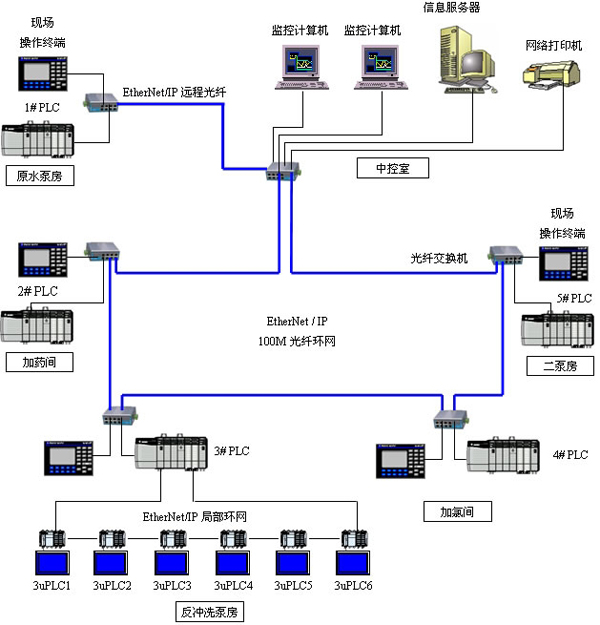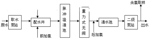 1 前言 氯是給水處理中使用最廣泛的消毒劑,在管道水中維持一定量的余氯,不僅可以抑制水中的細菌再繁殖,防止管網(wǎng)污染;控制生物膜的形成;而且當水在輸送中受到再次污染時,還可起到一定的保護作用,抑制已入侵的病原菌的活力。同時它還有助于維持水質(zhì)的美學(如減少色度等)。所以,維持管網(wǎng)余氯是保證水質(zhì)的一項重要措施。 目前,各水司對如何合理加氯問題都表現(xiàn)出極大的興趣,但真正做到合理加氯的供水系統(tǒng)則很少。凈水中余氯濃度太低不能很好地起到消毒作用,太高則會導致水廠附近管網(wǎng)水的氯濃度較高,產(chǎn)生味覺及嗅覺的不適,浪費藥劑,提高生產(chǎn)成本,同時消毒副產(chǎn)物濃度增加,使水質(zhì)安全性降低。因此各水司都努力尋找加氯量的平衡點,即在保證消毒滅菌的同時,盡量減少消毒劑用量。信息化技術(shù)是供水系統(tǒng)發(fā)展的必然趨勢,采用先進的自動化加氯控制系統(tǒng)是水廠實現(xiàn)自動化必不可少的措施之一。2 自動加氯控制原理 為達到消毒效果,又不造成氯氣的浪費,必須根據(jù)原水流量的變化及后續(xù)水質(zhì)的變化及時調(diào)整加氯量的大小。顯然采用人工調(diào)節(jié)是很難實現(xiàn)的,采用先進的控制技術(shù)實現(xiàn)加氯自動化是很有必要的。采用如圖1所示的自動加氯控制系統(tǒng)。 目前,凈水廠大多有預氯化措施,故加氯系統(tǒng)通常包括前加氯和后加氯。前加氯投加點的位置主要從工藝的角度來考慮,常設在原水總管上。加氯控制方式一般采用原水流量配比加氯方式,其控制原理為:加氯控制器根據(jù)原水流量的變化以及設定的投加率自動調(diào)節(jié)加氯量。后加氯通常是濾后加氯,加氯點一般設在清水池進水管。后加氯是保證出廠余氯的主要環(huán)節(jié),它直接關系到出廠水余氯的合格率和穩(wěn)定性,因此,后加氯控制相對前加氯而言是比較復雜的。常采用復合環(huán)自動加氯方式,即根據(jù)濾后水流量及出廠水余氯反饋控制方式構(gòu)成復合環(huán)控制。其控制原理為:加氯控制器根據(jù)原水流量以及投氯后取樣水中余氯值和設定的余氯值,通過PLC中的PID(比例、積分、微分)調(diào)節(jié)控制加氯量,輸出一個控制量來控制加氯機的投加裝置(如控制閥門開啟度調(diào)節(jié))形成一個閉環(huán)控制,使余氯值向設定值逼近,確保出廠水余氯指標。余氯的設定值應根據(jù)水質(zhì)要求進行設定,保證管網(wǎng)中余氯符合飲用水標準。隨著季節(jié)和氣候的變化和供水管網(wǎng)的情況以及原水水質(zhì)的不同,余氯的設定值應隨時進行調(diào)整。為了能較穩(wěn)定控制加氯,應在氯后總管上設置流量計,以便將濾后水流量引入到加氯控制中,采用比例加PID的復合環(huán)控制。 圖1 自動加氯示意圖 圖2 加氯工作流程圖 如圖2示:前加氯系統(tǒng)與后加氯系統(tǒng)共用一個氯氣氣源,共設兩組供氯氯瓶,兩組氯瓶互為備用.,根據(jù)氣瓶壓力自動切換。如當正在使用的一組氯瓶出口管上的壓力小于某個值時,壓力式自動切換器將自動切換到另一組氯瓶,保證連續(xù)供氯。在加氯自動控制系統(tǒng)中,將PLC的模擬量輸出信號送給加氯機的模擬量輸入端,通過控制加氯機中執(zhí)行器的動作,控制水射器中的真空度,進而控制了加氯量的大小。加氯自動控制系統(tǒng)中還包括氯氣氣源的自動切換,漏氣自動報警和漏氯吸收裝置的自動控制。在加氯自動控制系統(tǒng)中,關鍵是對加氯機的控制。 自動控制氯系統(tǒng)可進一步配備計算機數(shù)據(jù)采集系統(tǒng),以便實現(xiàn)加氯間無人值班目標。把出廠水中的余氯分析儀測定的數(shù)據(jù)送到加氯間,中心化驗室和調(diào)度室,以便值班人員可隨時監(jiān)測出廠水余氯值和調(diào)整余氯設定值。 3影響加氯自動控制的主要原因(1)采樣時間 采樣時間的長短,直接影響加氯的效果。為了達到自動控制的目的,要求氯氣經(jīng)充分混合后馬上檢查余氯值作為復合環(huán)控制的反饋信號。但現(xiàn)場中,有的工藝設計將混合接觸時間定的太長,對控制系統(tǒng)來說,即意味著純滯后時間的延長,造成測定結(jié)果不準確。因此,在后加氯的投加點和采樣點的選擇上,工藝設計時應充分考慮自動控制的要求。通常情況下,后加氯在清水池進水管上,在氯氣與水充分混合后應在盡可能短的時間內(nèi)取樣,水經(jīng)過加氯點到余氯分析儀處的水流時間一般不要超過5分鐘,在水與氯氣充分混合的前提下取樣時間越短越好??捎萌缦露N方法論縮短取樣時間:一是縮短取樣管的長度;二是加快取樣管中的水流速度如加大取樣水管排水分流管。(2)檢測設備 余氯分析儀的檢測值的正確性也是控制加氯的關鍵。由于余氯分析儀存在零點漂移,應定期進行校正。同時在軟件編制時,對信號數(shù)據(jù)的處理也可考慮濾波、穩(wěn)定等形式進行適當處理以增加數(shù)據(jù)的可靠性。(3)信號傳輸 主要是各底層設備的檢測信號要及時準確的傳輸?shù)絇LC中,然后進行處理。現(xiàn)場中大都設備采用標準電流信號(0―20mA或4―20mA)。4 自動加氯系統(tǒng)的應用 南方某一水廠,以江水為水源,水廠原設計規(guī)模為6萬m3/d。工藝流程如下示: 圖3 凈水工藝流程圖 采用如上所述的自動加氯控制系統(tǒng)。選用德